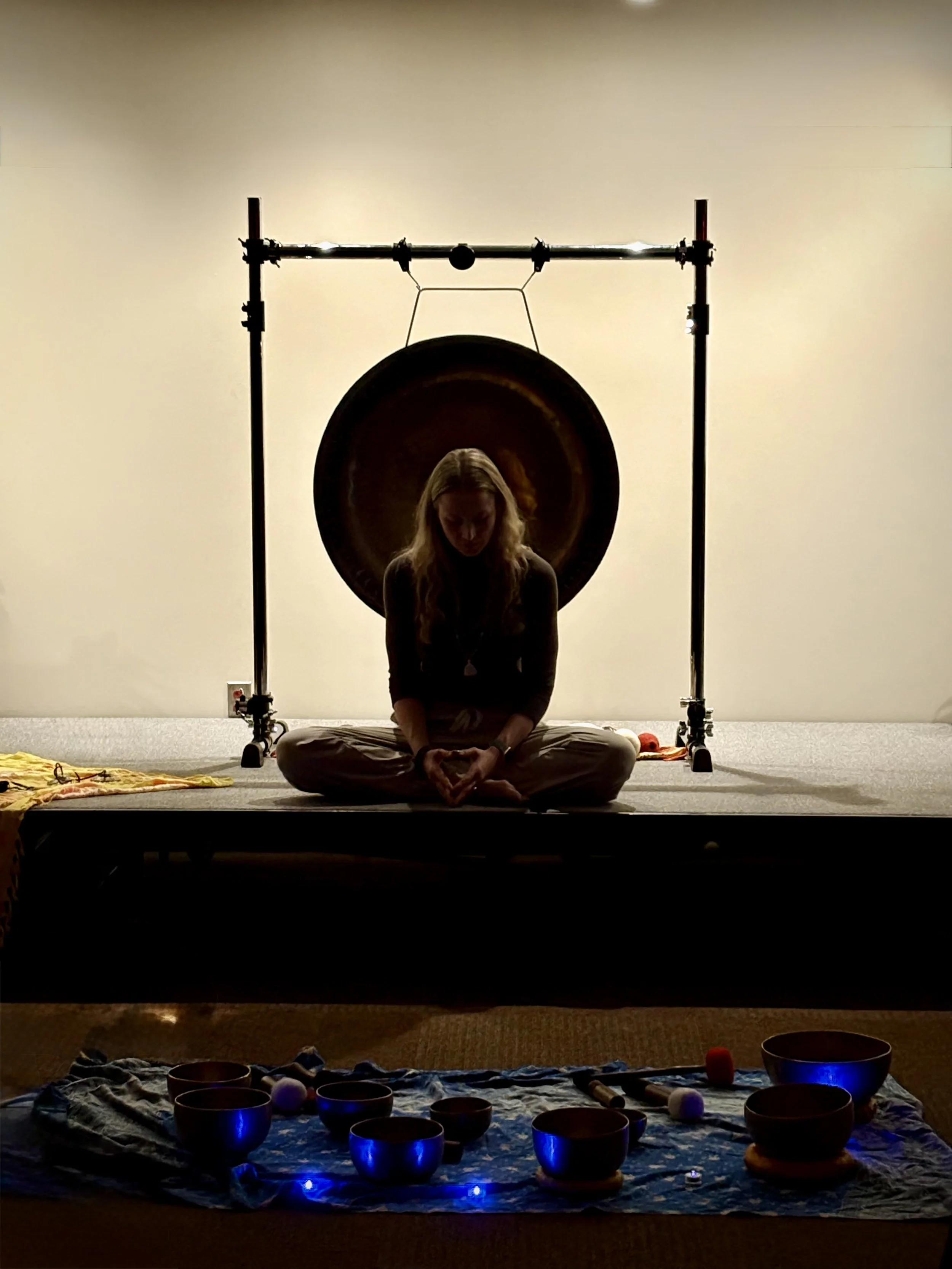 Sound meditation is an integrated practice that combines a restorative setting with an emphasis on breath, mindful presence, and judicious listening. Instruments such as Tibetan singing bowls, etheric chimes, frame drums, rattles, and the gong are played during the meditation. This container empowers participants to use sound as a therapeutic tool to disconnect from the monkey mind and delve into an embodied state - disengaging from habitual patterns of thought and behavior, intitating beneficial cognitive change.